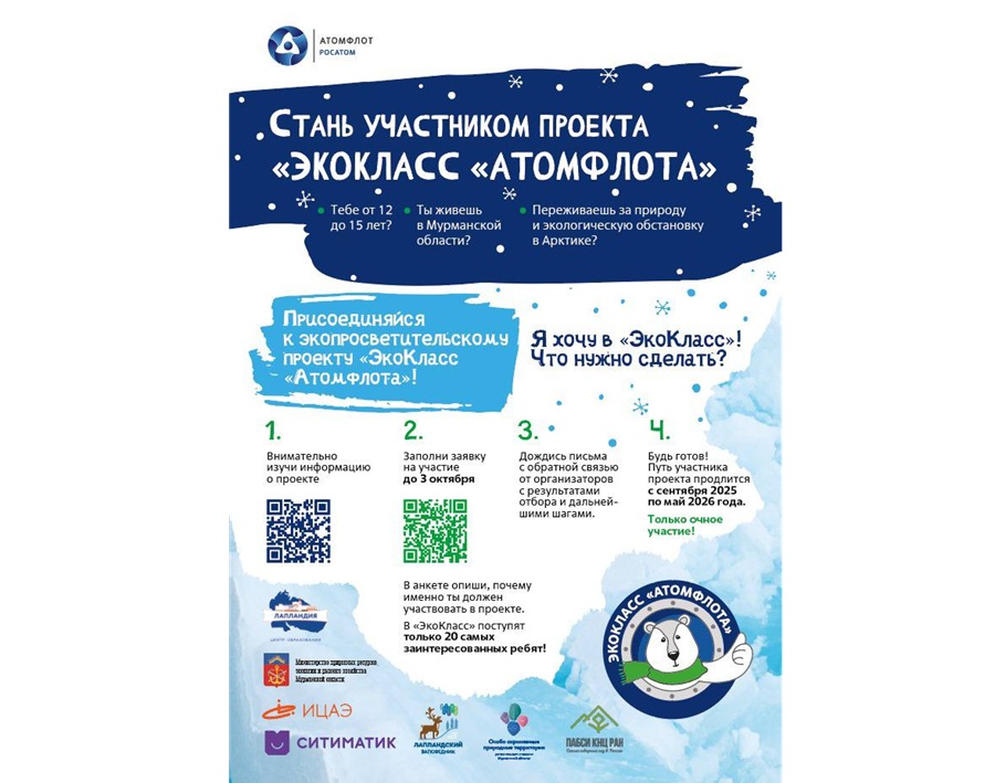 ФГУП «Атомфлот» объявило набор участников на третью смену экологопросветительского проекта «ЭкоКласс «Атомфлота». Подать заявку можно до 3 октября 2025 года, сообщает пресс-служба предприятия.