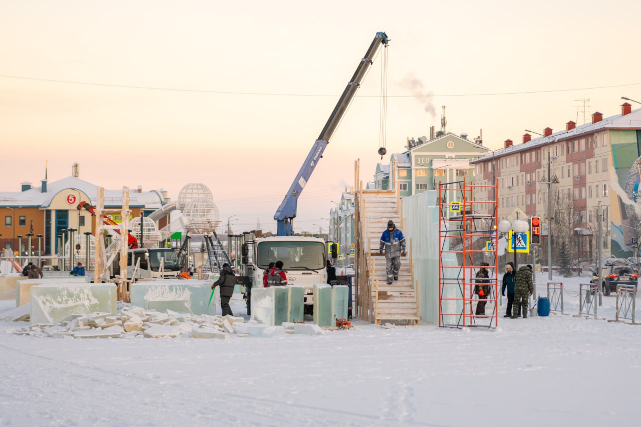 На главной площади Салехарда началось создание новогоднего ледового городка, посвященного 65-летию первого полета человека в космос. Комплекс объединяет пять больших горок, малые горки для детей, лабиринт, ледяные скульптуры и интерактивные элементы, все в тематике полета Юрия Гагарина на «Востоке-1».